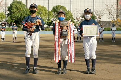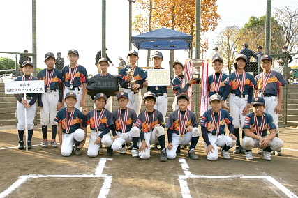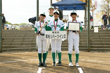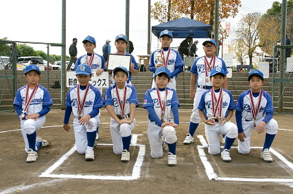 栗原ビーバーズに金メタル、 若松ブルーウィングスに銀メタル、 新倉フェニックスに銅メタル、 和光リバーツインズに銅メタルが贈られました。 写真は、金メタルの栗原ビーバーズです。 |