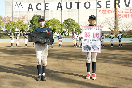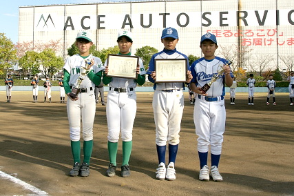 栗原ビーバーズと若松ブルーウィングスに 副賞のジャイアンツ・スポーツバッグが贈られました。 |