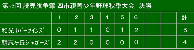 | 朝志ヶ丘ジャガーズ | 6 | 4 | 1 | × | 計11 |